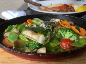 メニュー: 魚といろいろ野菜のオーブン焼き チコリのサラダ マッシュルームのサラダ デザート